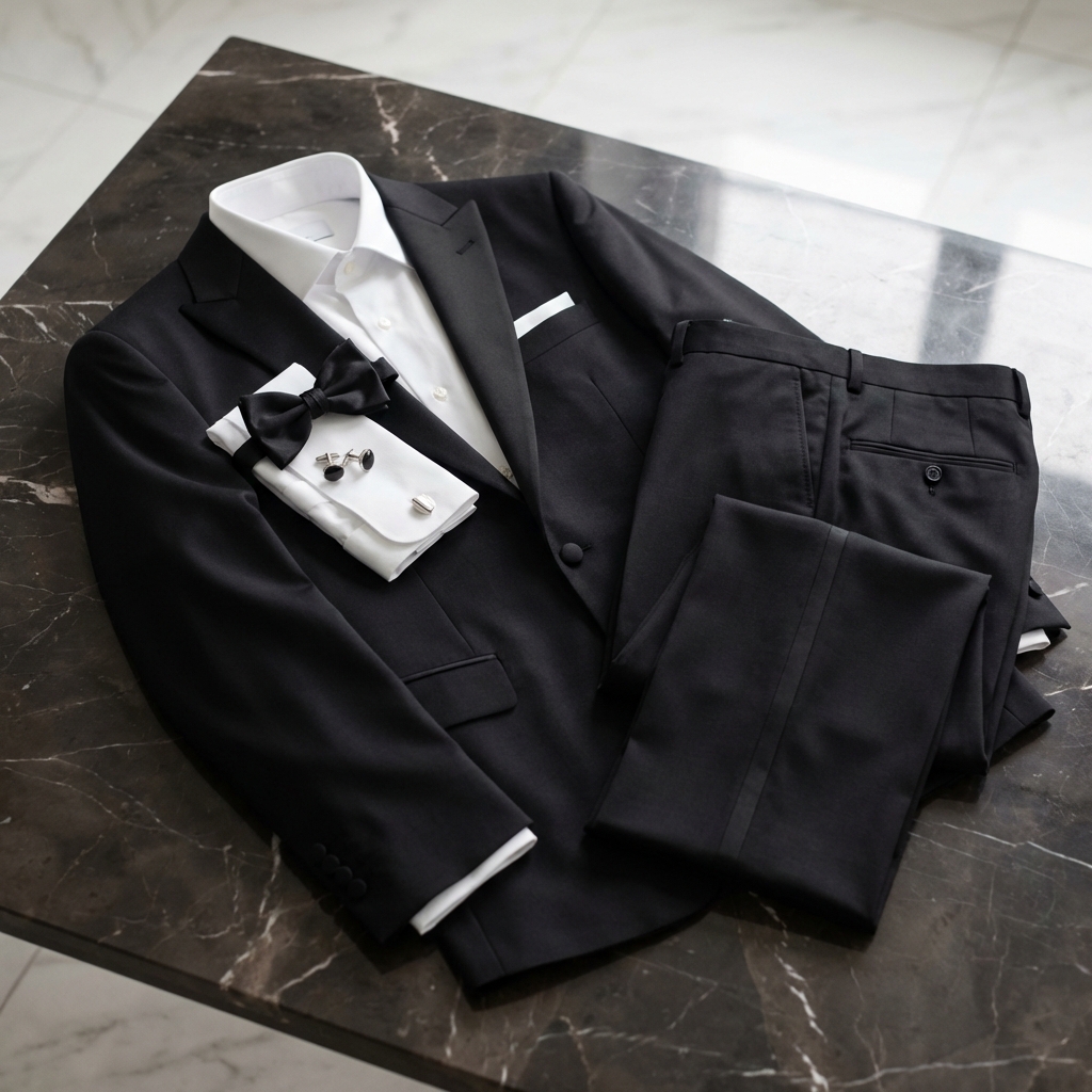 A tuxedo suit is a formal evening ensemble
