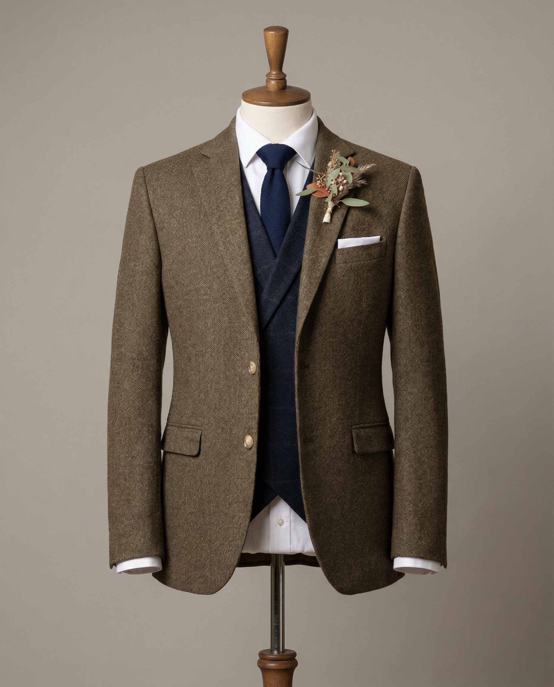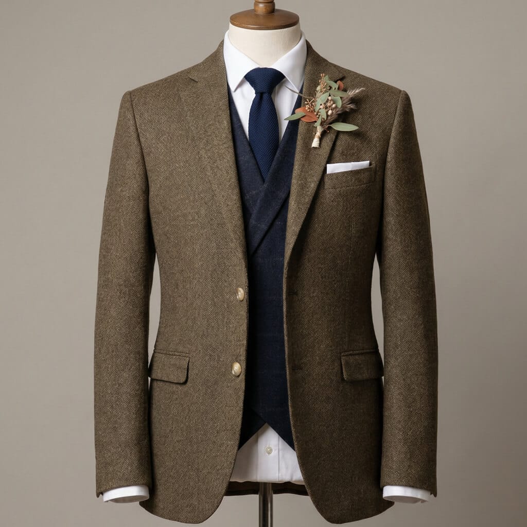 Woven from premium wool tweed—likely a Donegal-inspired variety—the fabric boasts a textured, slightly flecked surface in warm brown tones with subtle variations that catch the light beautifully. This durable, breathable cloth provides natural warmth and water resistance, perfect for outdoor ceremonies or cooler British seasons, yet remains comfortable indoors. The tweed’s rugged charm pairs strikingly with the deep navy waistcoat and tie, accented by a fresh boutonnière of seasonal foliage and blooms for a groom-ready flourish. Crisp white shirt cuffs peek from the sleeves, and a pocket square completes the polished look.