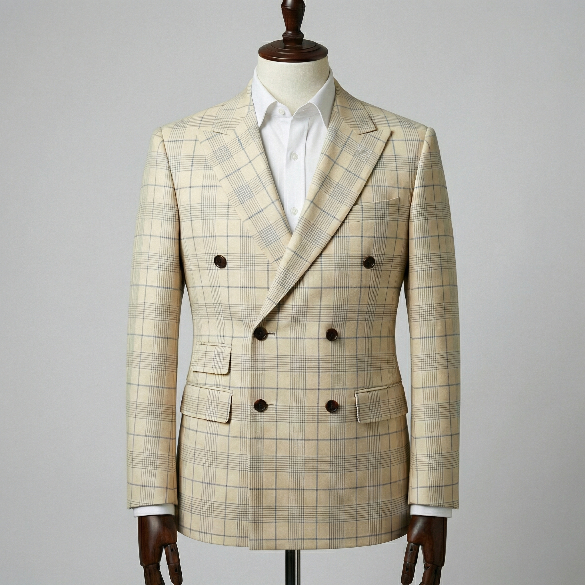 Experience the height of bespoke elegance with this made-to-measure double-breasted suit in a refined beige windowpane check. Crafted exclusively for you, every element is cut and tailored to your precise measurements, posture, and personal style—delivering a fit that ready-to-wear garments simply cannot rival.