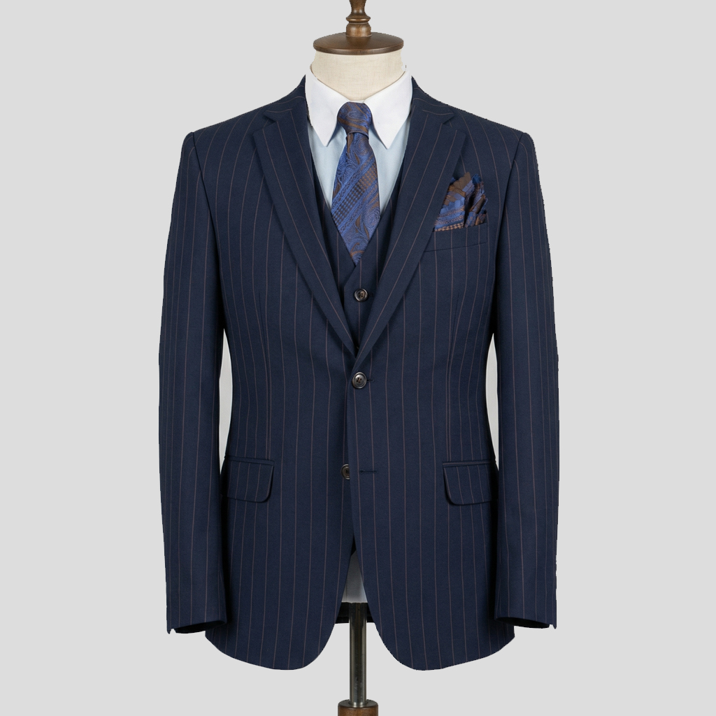 Timeless sophistication meets classic style in this navy pinstripe three-piece suit — a refined essential for the modern gentleman.