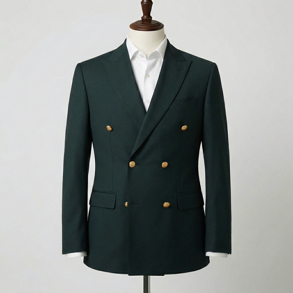 This distinguished dark green double-breasted blazer radiates classic British authority with a touch of timeless swagger. Crafted from rich, high-quality wool (or a superior wool blend), the deep forest-green hue offers exceptional depth and versatility—striking yet refined, ideal for autumn through to winter, and equally commanding in evening settings.