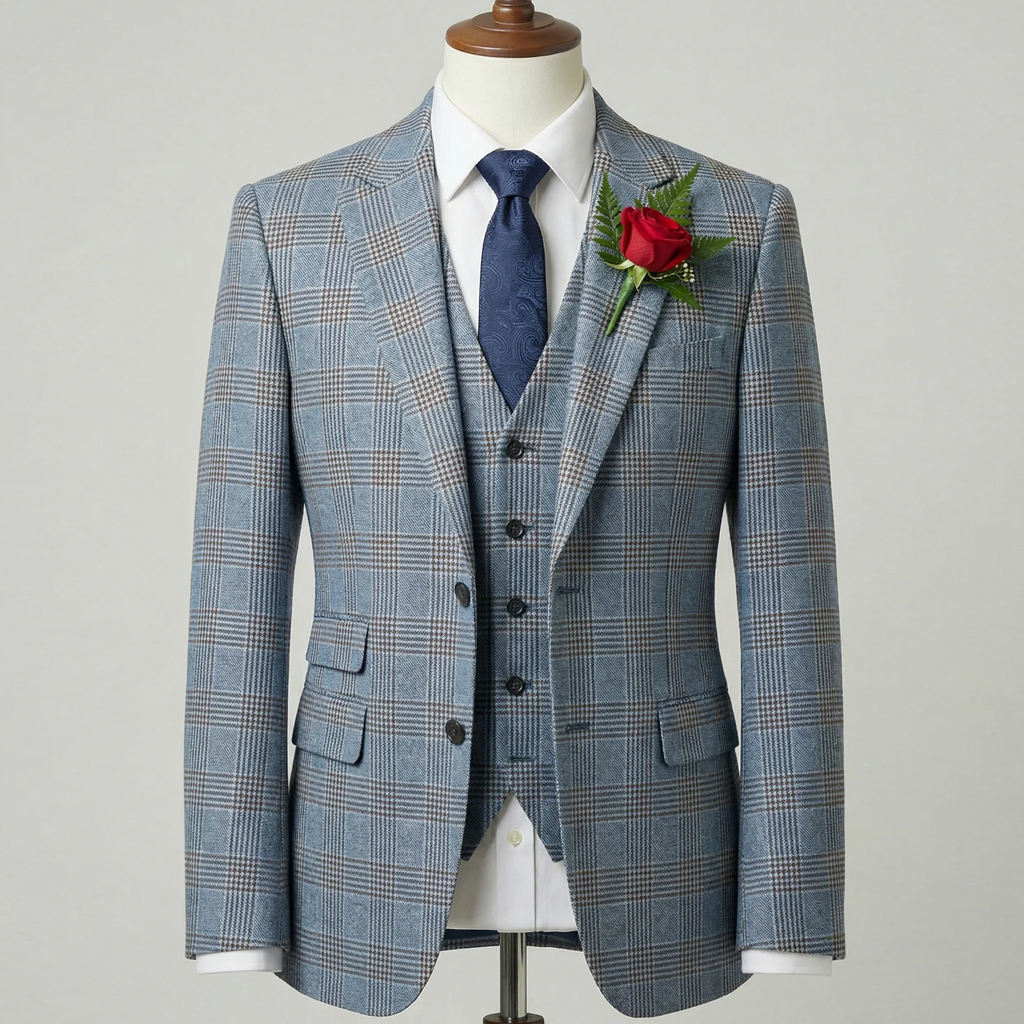 This impeccably tailored three-piece suit in soft light blue with a subtle windowpane plaid pattern combines refined sophistication and subtle personality. Crafted from premium wool-blend fabric, the crisp check design in muted tones delivers classic texture and visual interest without overwhelming, making it an ideal choice for transitional seasons or year-round wear.