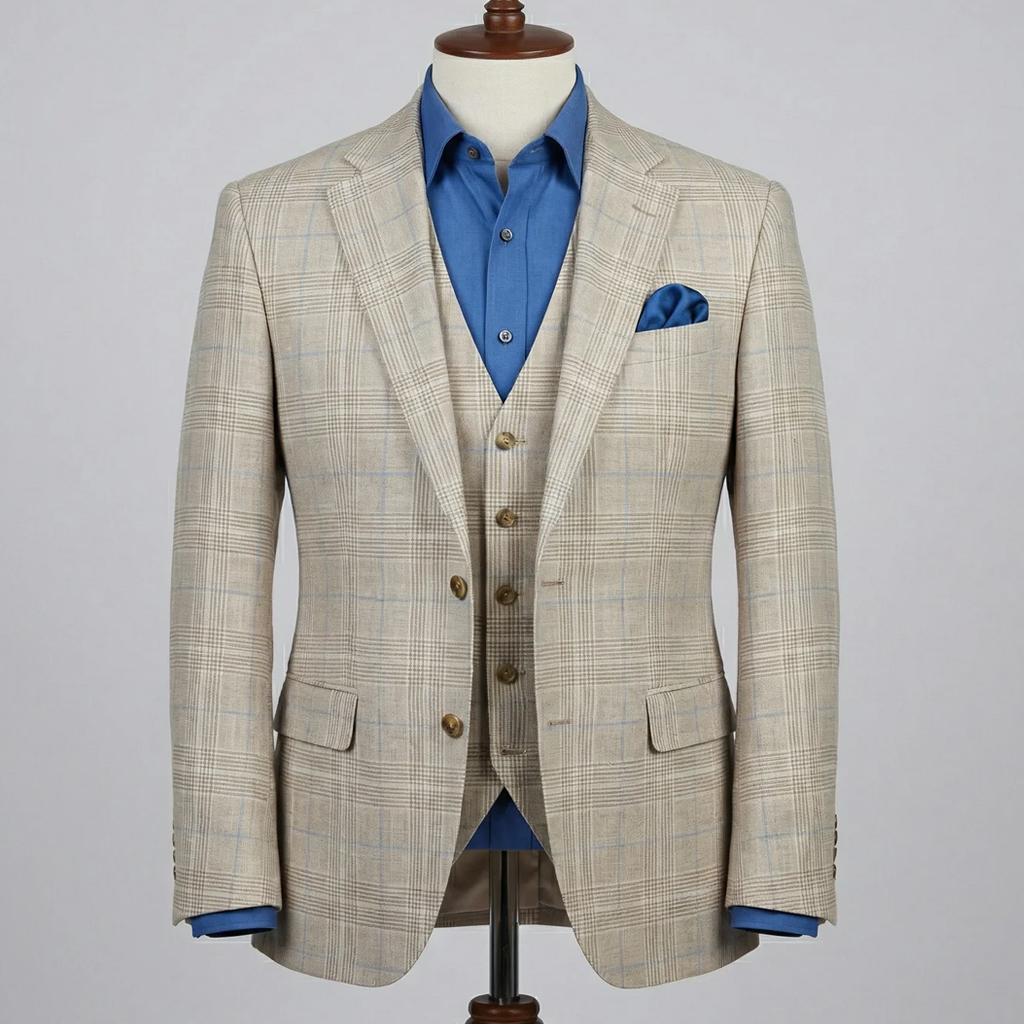 This impeccably tailored three-piece suit in soft beige with a classic Prince of Wales check pattern radiates refined heritage and contemporary elegance. Crafted from premium lightweight wool or wool-blend fabric, the subtle yet distinctive plaid in neutral tones interwoven with faint contrasting lines delivers rich texture and timeless sophistication, perfect for spring, summer weddings, garden parties, daytime formal events, or smart-casual professional settings.