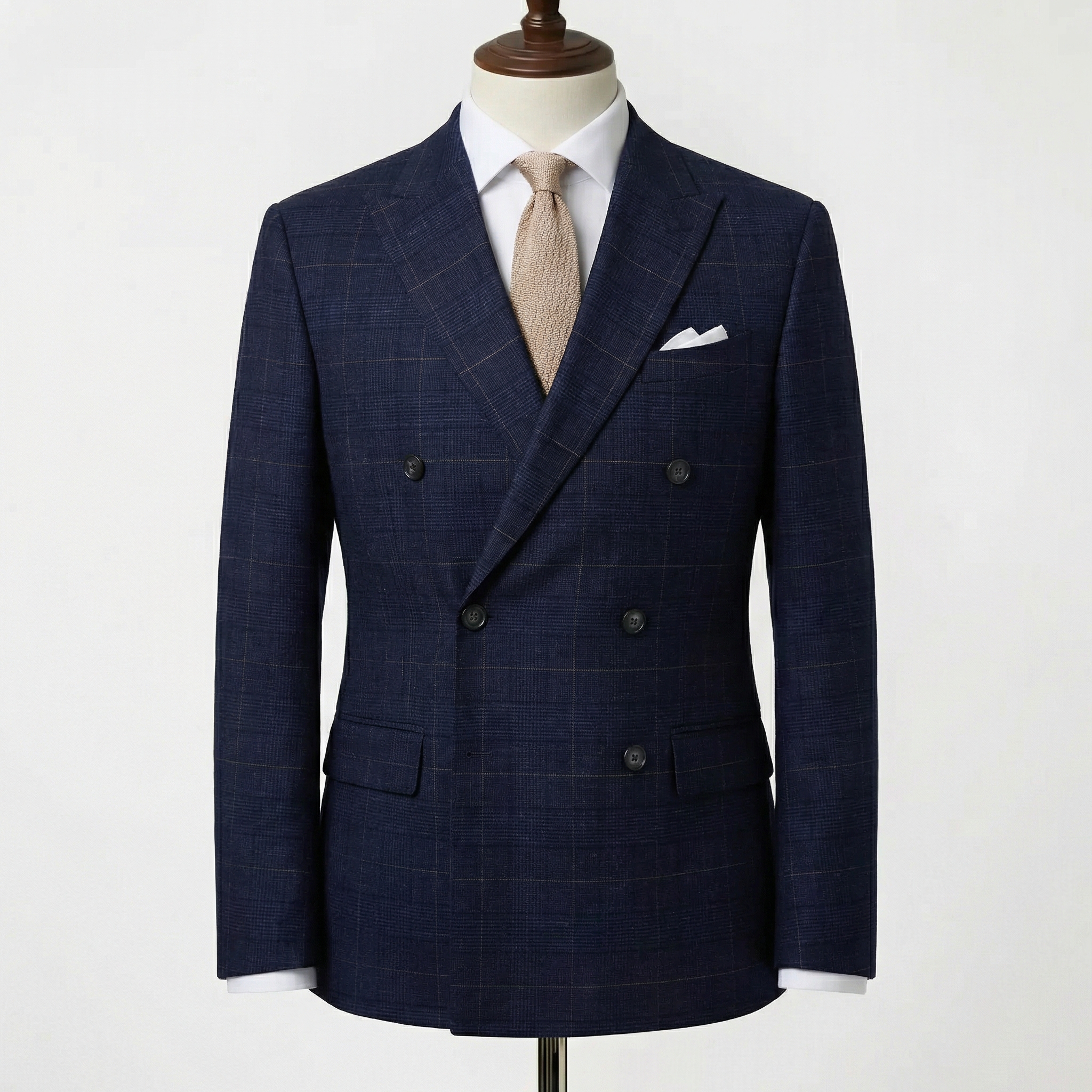 This striking navy double-breasted suit commands attention with classic power-dressing appeal and sophisticated detailing. Tailored from a high-quality wool-blend fabric (often with a subtle sheen and excellent drape), it features a rich, deep navy base overlaid with a refined windowpane check—delicate light-grey or tonal lines forming oversized, understated squares that add depth and visual interest without being loud or busy.
