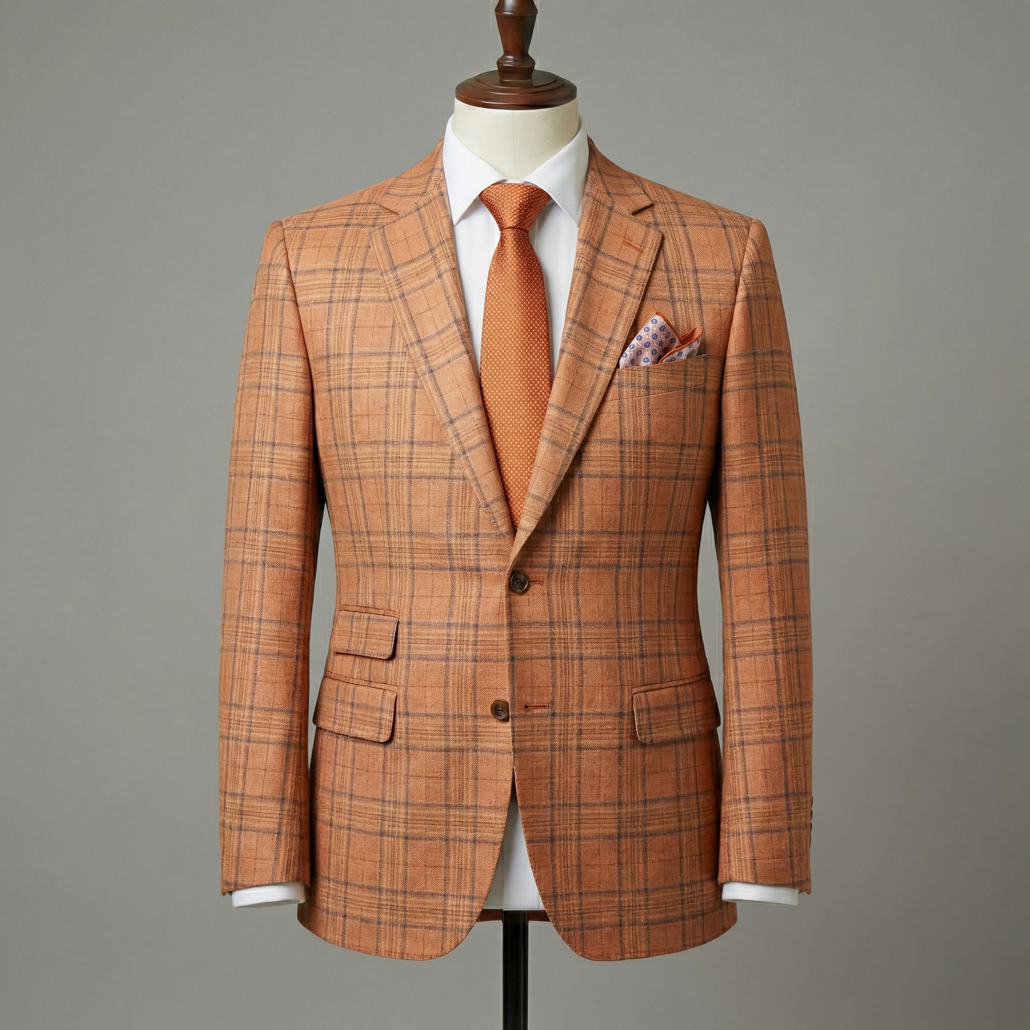 Superior construction—half- or fully canvassed—ensures excellent shape retention and a natural drape that softens and moulds beautifully with wear, while partial lining provides breathability and comfort across transitional seasons. As styled here with a tonal orange tie and crisp white shirt, this piece excels for autumn weddings, smart-casual events, race days, or any occasion calling for spirited yet polished style; equally striking when paired with navy trousers or denim for versatile refinement.