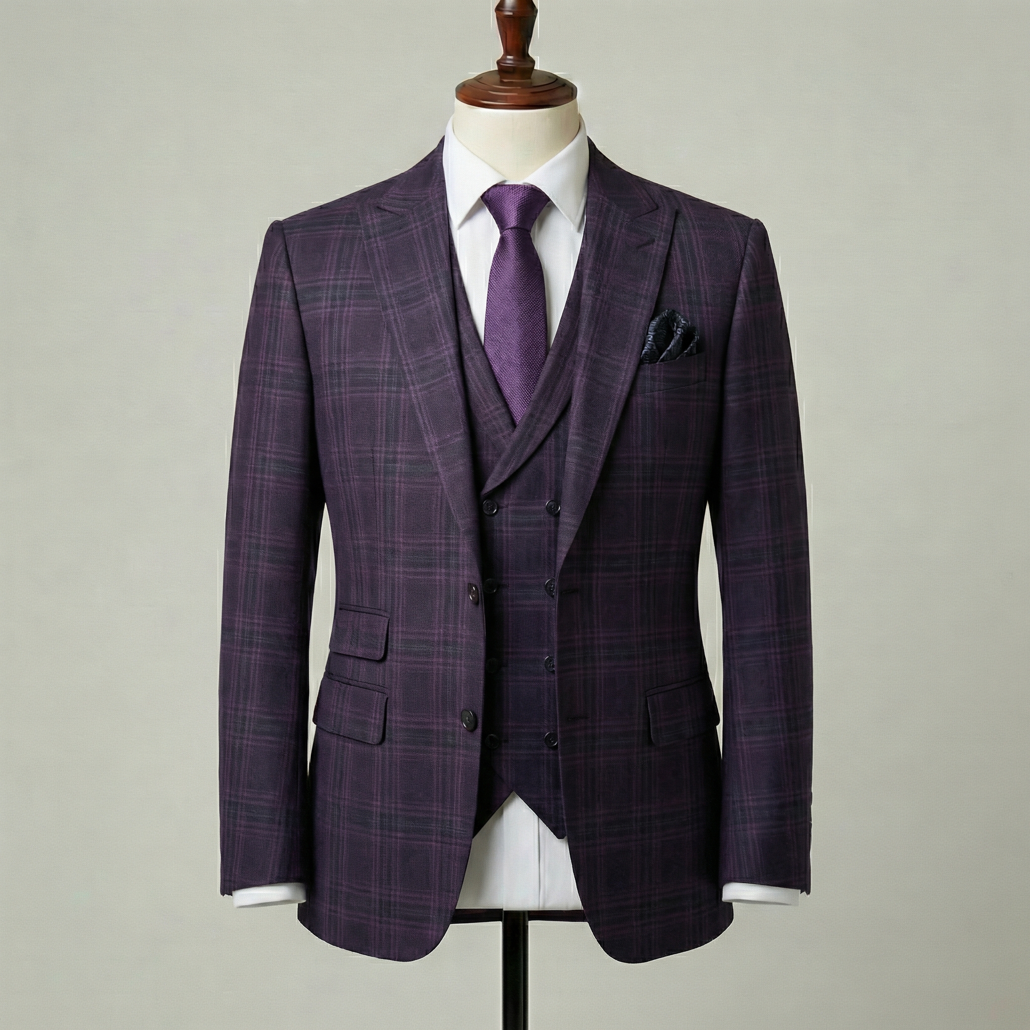 This impeccably tailored three-piece suit in rich purple with a subtle windowpane check pattern radiates bold sophistication and contemporary style. Crafted from premium wool-blend fabric, the refined grid design in deep plum tones adds understated texture and visual intrigue, striking a perfect balance between classic heritage and modern confidence.
