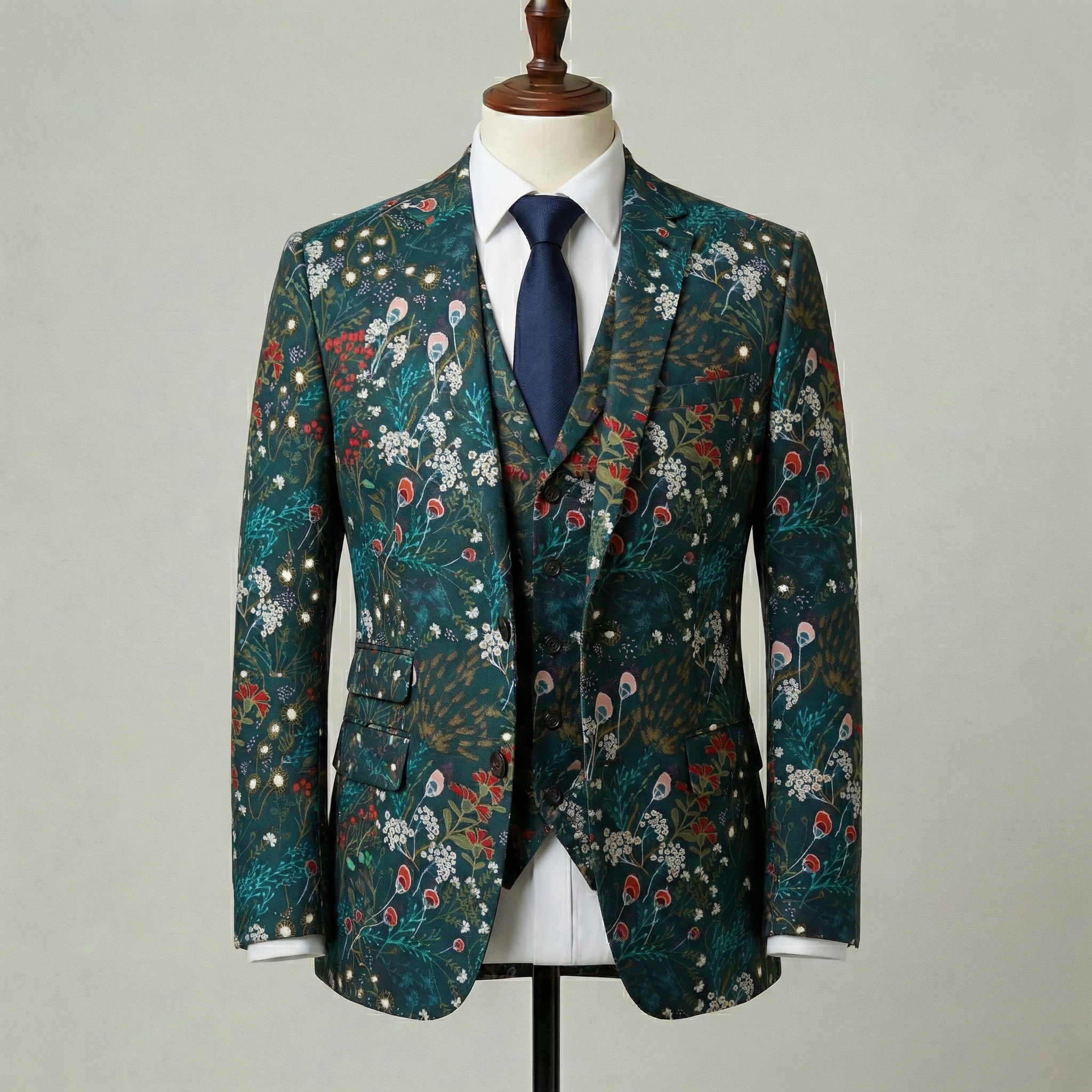 This distinguished three-piece teal floral suit is a masterpiece of daring elegance and artistic British flair. Tailored from luxurious, high-grade wool (or a premium wool-silk blend), the fabric boasts an opulent deep teal ground alive with an intricate, multicoloured botanical print—vibrant blooms, delicate foliage, and subtle ornamental motifs in rich reds, soft pinks, crisp whites, and hints of gold weave together in a joyful yet sophisticated explosion of pattern.