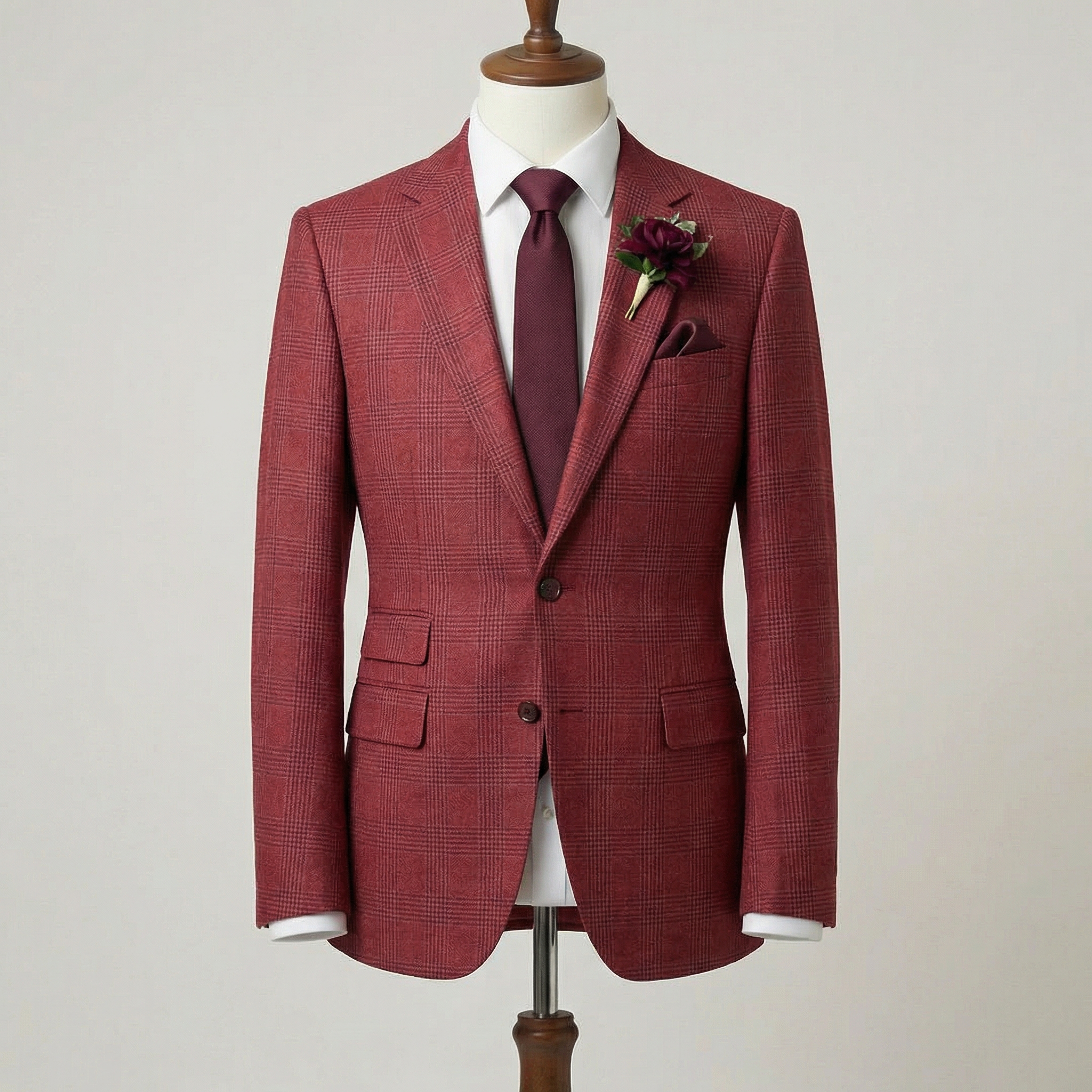 This impeccably tailored three-piece suit in rich burgundy with a subtle windowpane check pattern radiates warm sophistication and distinctive style. Crafted from premium wool or wool-blend fabric, the refined grid design in deep red tones adds texture and subtle depth, creating an eye-catching yet elegant appearance perfect for fall and winter occasions.
