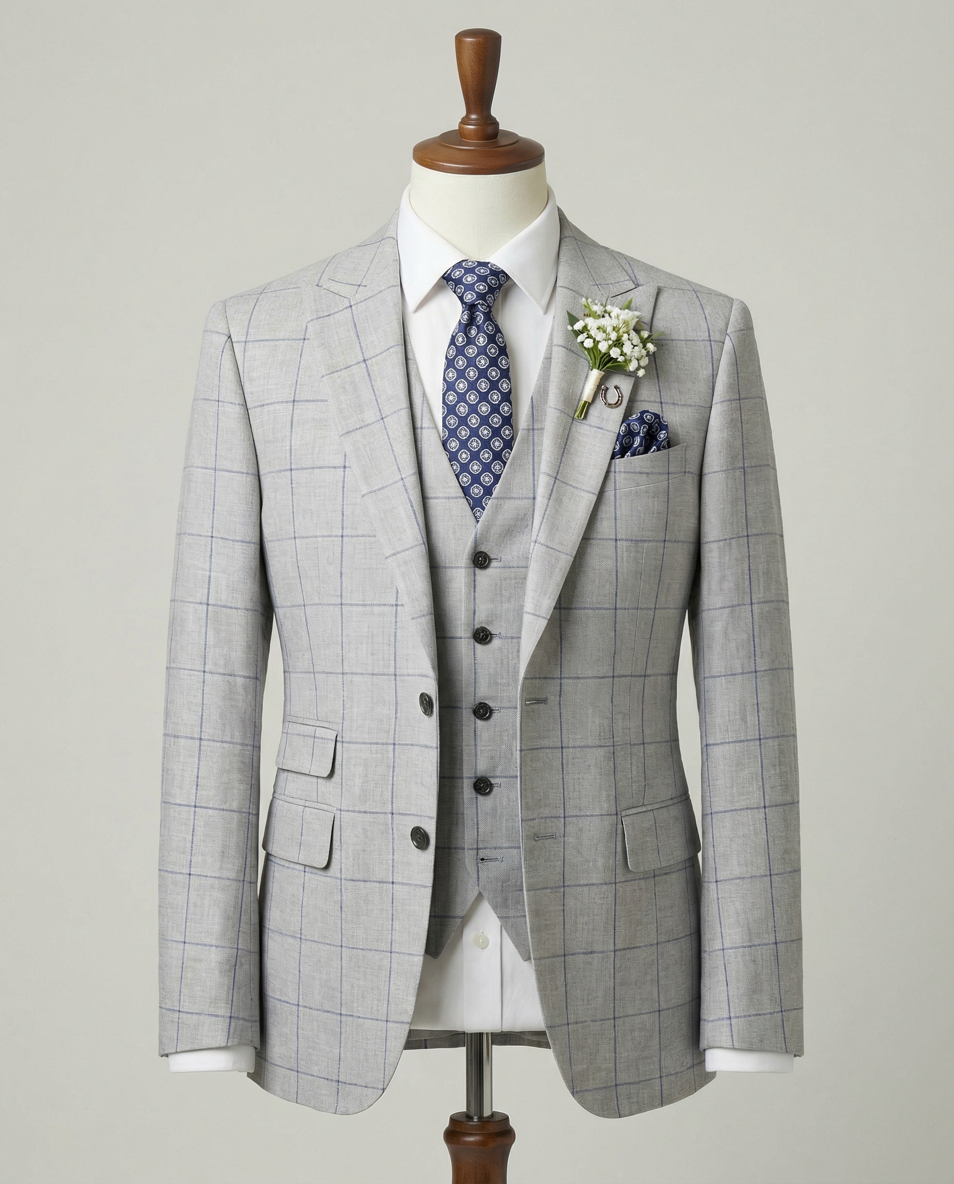 The soft light grey base interwoven with delicate windowpane checks creates depth and visual interest—versatile enough to pair with crisp white shirts for a clean, fresh appearance or light blue for subtle harmony. As styled here with a patterned blue tie, pocket square, and fresh boutonniere, it crafts an effortlessly groom-ready or guest-worthy ensemble that’s polished yet approachable.