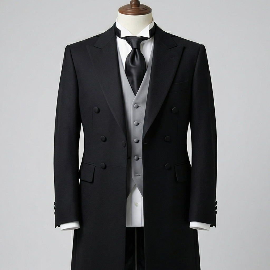 This classic black morning dress suit (also known as a morning coat or cutaway ensemble) represents the pinnacle of dignified, traditional formal daytime attire—perfectly suited for the solemn professionalism required of funeral directors, memorial services, or any occasion demanding utmost respect and understated authority.