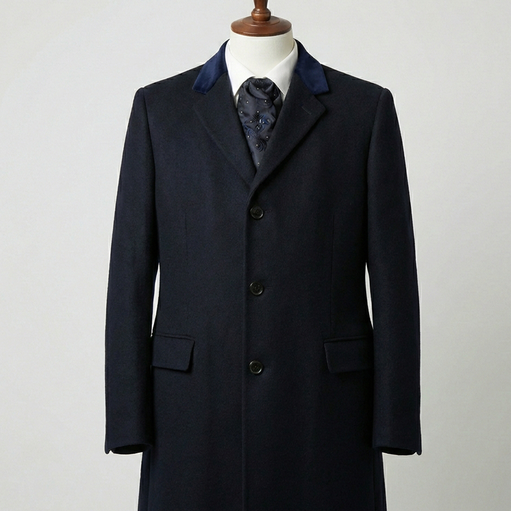 Expertly crafted from a premium wool or wool-cashmere blend in a deep, rich navy hue, it offers exceptional warmth, subtle sheen, and superior drape—ideal for outdoor ceremonies, processions, or inclement weather while maintaining a polished, non-reflective appearance that aligns perfectly with the gravity of the occasion.