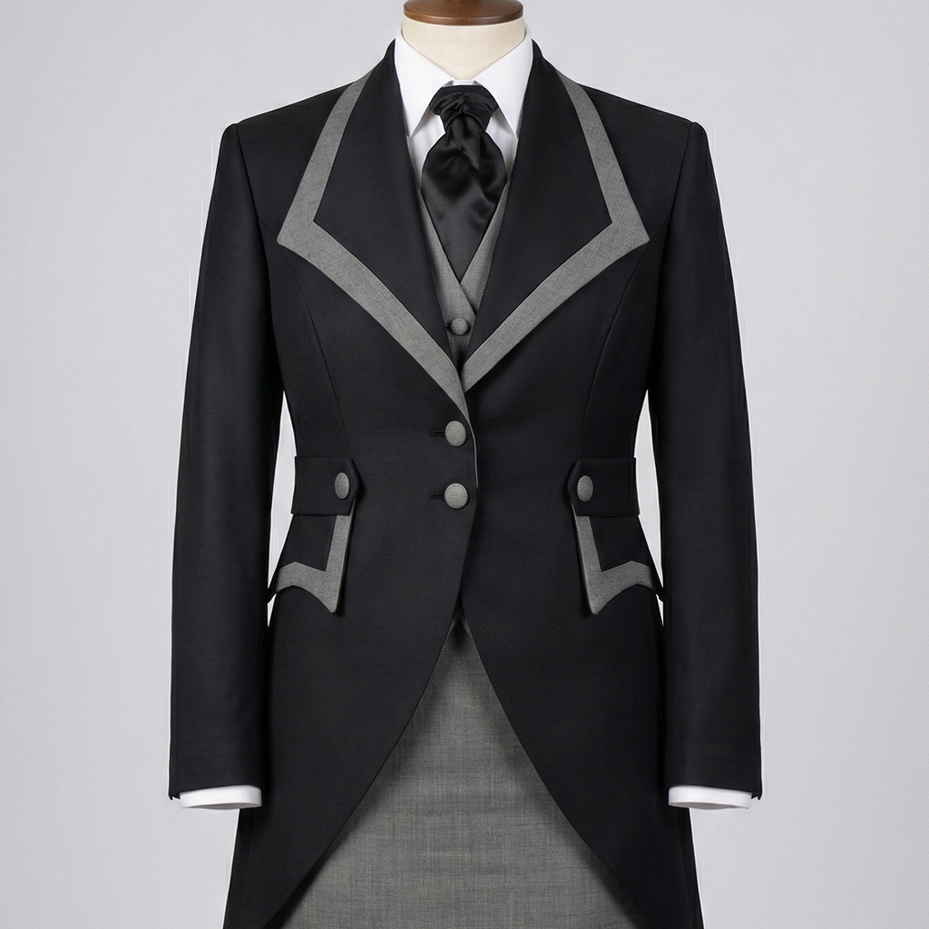 Crafted from premium black wool (fine worsted or subtle weave for excellent drape and understated texture), the ensemble features a long cutaway morning tailcoat with dramatic elongated tails at the back and a sweeping front curve. It stands out with elegant contrast grey piping and borders along the wide peak lapels, front edges, pocket welts, and tail hems—adding subtle definition and a touch of restrained sophistication without compromising the monochromatic gravity essential for mourning duties.