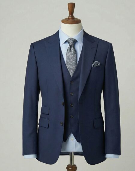 This distinguished three-piece navy suit embodies timeless British elegance and impeccable versatility. Tailored from luxurious pure wool (or a high-grade wool blend), the fabric presents a rich, deep navy tone with a subtle sheen and fine weave that conveys quiet authority and sophistication. The single-breasted jacket is cut with classic notched