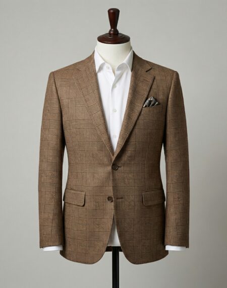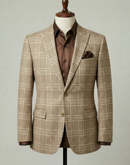 This impeccably tailored single-breasted suit in warm tan with a classic Prince of Wales check pattern exudes refined heritage and effortless sophistication. Crafted from premium wool or wool-blend fabric, the bold yet balanced plaid in earthy beige and brown tones delivers rich texture and timeless character, making it a standout