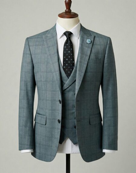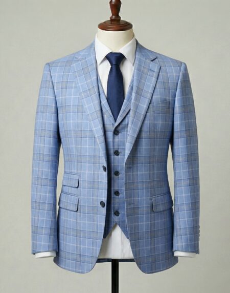 This impeccably tailored three-piece suit in soft light blue with a subtle windowpane plaid pattern combines refined sophistication and subtle personality. Crafted from premium wool-blend fabric, the crisp check design in muted tones delivers classic texture and visual interest without overwhelming, making it an ideal choice for transitional seasons or