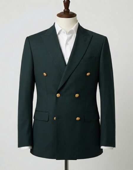 This distinguished dark green double-breasted blazer radiates classic British authority