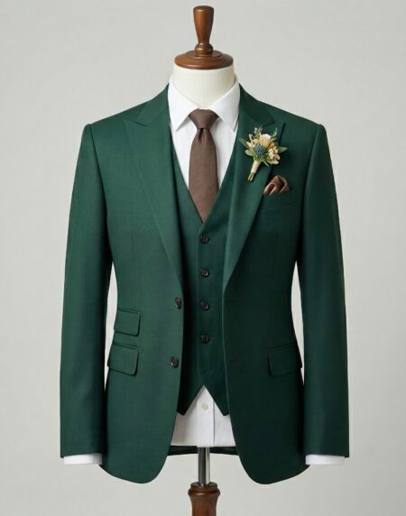 This emerald green three-piece tailored suit exudes sophisticated elegance and