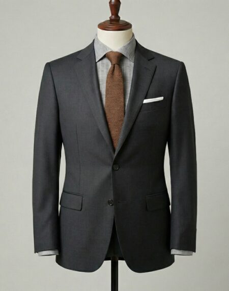 This charcoal grey tailored suit embodies timeless sophistication and understated