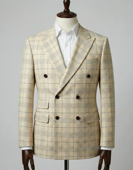 Experience the height of bespoke elegance with this made-to-measure double-breasted suit in a refined beige windowpane check. Crafted exclusively for you, every element is cut and tailored to your precise measurements, posture, and personal style—delivering a fit that ready-to-wear garments simply cannot rival. The cloth—a superior lightweight wool or wool blend