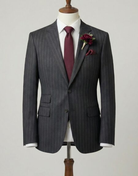This charcoal grey pinstripe three-piece tailored suit exudes classic power and timeless sophistication with its subtle, refined stripes—delivering boardroom authority, wedding-day elegance, or event-ready polish that never goes out of style. The deep charcoal base with delicate light pinstripes creates understated texture and visual interest—versatile enough to pair with crisp white