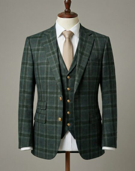 This hunter green plaid three-piece tailored suit captures rugged sophistication
