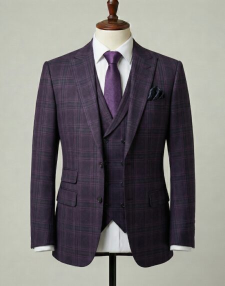This impeccably tailored three-piece suit in rich purple with a subtle windowpane check pattern radiates bold sophistication and contemporary style. Crafted from premium wool-blend fabric, the refined grid design in deep plum tones adds understated texture and visual intrigue, striking a perfect balance between classic heritage and modern confidence. Styled here