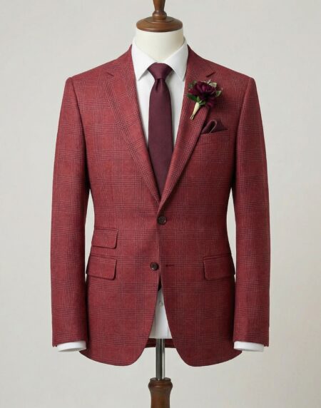 This impeccably tailored three-piece suit in rich burgundy with a subtle windowpane check pattern radiates warm sophistication and distinctive style. Crafted from premium wool or wool-blend fabric, the refined grid design in deep red tones adds texture and subtle depth, creating an eye-catching yet elegant appearance perfect for fall and