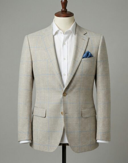 This impeccably tailored single-breasted suit in soft light grey with a subtle windowpane check pattern brings refined warmth and effortless sophistication. Crafted from premium lightweight wool or wool-linen blend fabric, the gentle neutral tone combined with delicate grid texture offers excellent breathability and a relaxed yet polished appearance, making it