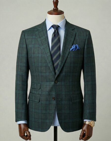 This impeccably tailored single-breasted suit in rich forest green with a subtle windowpane check pattern exudes sophisticated depth and modern elegance. Crafted from premium wool or wool-blend fabric, the deep green base interwoven with fine grid lines delivers refined texture and visual interest while remaining versatile and timeless, ideal for