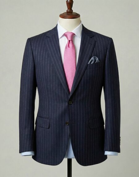 This impeccably tailored single-breasted suit in classic navy blue with fine white pinstripes combines timeless authority with subtle modern flair. Crafted from premium wool or wool-blend fabric, the crisp vertical pinstripes elongate the silhouette and add understated sophistication, delivering a sharp, professional appearance that remains versatile across seasons. Ideal for business
