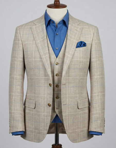 This impeccably tailored three-piece suit in soft beige with a classic Prince of Wales check pattern radiates refined heritage and contemporary elegance. Crafted from premium lightweight wool or wool-blend fabric, the subtle yet distinctive plaid in neutral tones interwoven with faint contrasting lines delivers rich texture and timeless sophistication, perfect