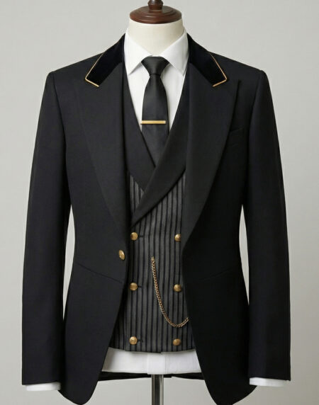 The Regency Sovereign is the pinnacle of professional funeral service attire, meticulously crafted for directors who command quiet respect and understated authority. Cut from premium black superfine wool, this three-piece ensemble features a sharp peak-lapel morning-style jacket accented with hand-finished gold piping along the collar and lapels, paired with gleaming