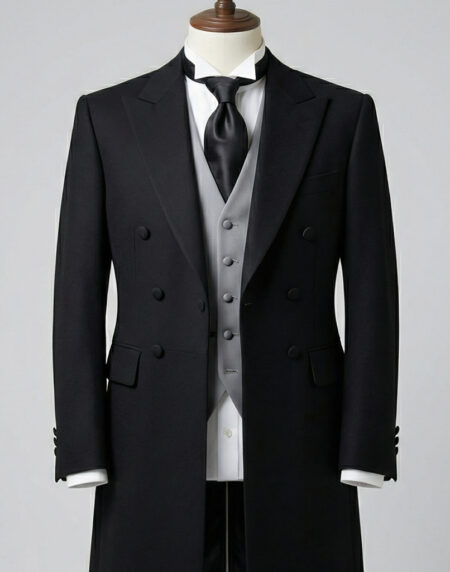 This classic black morning dress suit (also known as a morning coat or cutaway ensemble) represents the pinnacle of dignified, traditional formal daytime attire—perfectly suited for the solemn professionalism required of funeral directors, memorial services, or any occasion demanding utmost respect and understated authority.