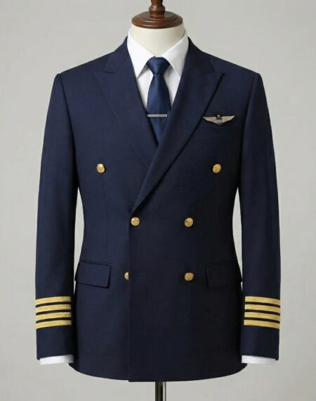 This classic double-breasted Airline Captain suit in deep navy blue delivers timeless authority and refined elegance. Featuring a sharp 6×2 gold-button front, peaked lapels, and structured shoulders, it projects the unmistakable presence of the pilot-in-command.